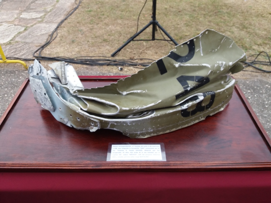 Ya en su casa, sobre esta mesa y bajo la custodia de honor se encuentran los restos del fuselaje del C-248 del Capitán (PM) D.Fausto Gavazzi |