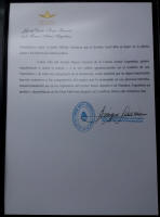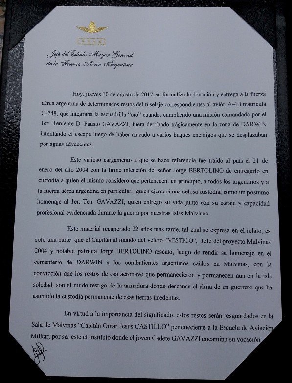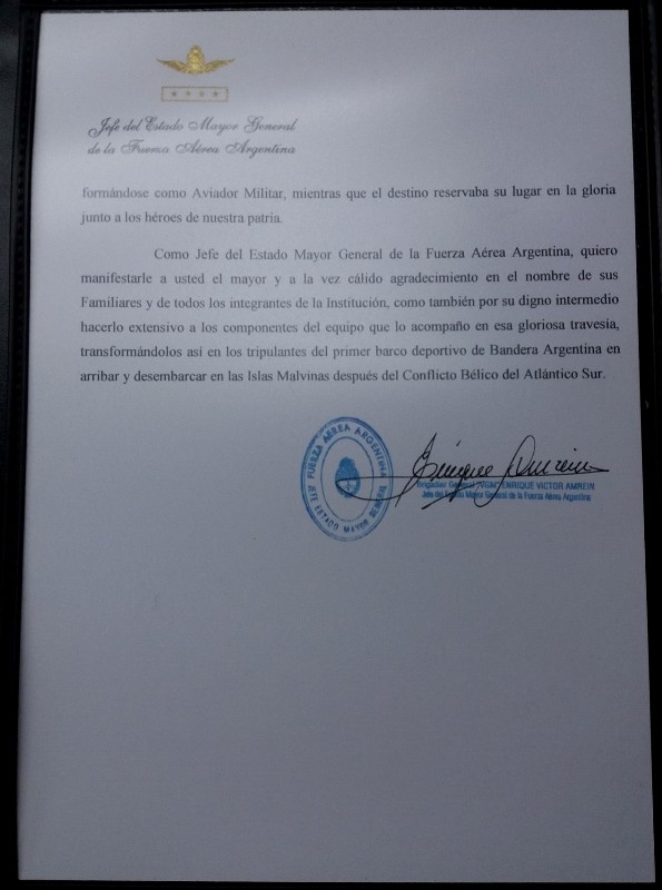 En contrapartida, recibí de manos del Sr. Jefe de Estado Mayor de la Fuerza Aérea Brigadier Mayor VGM D. Enrique Víctor Amrein, una carpeta de Fuerza Aérea Argentina, cuyo contenido me lleno de de orgullo. Contenido que comparto con mi equipo del Proyecto Malvinas 2004, mi tripulante Marcelo Gonzáles, con los colaboradores y con los Socios del Proyecto.