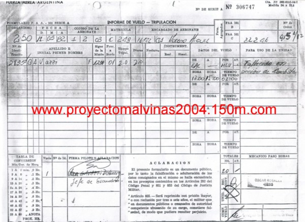 Veintiséis años después tuve la ocasión de conocer a sus Camaradas “Halcones”, los cuales se emocionaban cuando les comentaba que había estado junto a los restos del C-248 en Malvinas. Tuve oportunidad de visitar el bar de los “Halcones” y los simuladores de vuelo. Visite el Museo de la V Brigada, donde he recibido una gran atención por parte del Brigadier DESTRI, quien me obsequio especialmente una copia de la última Planilla de Vuelo del C-248. |