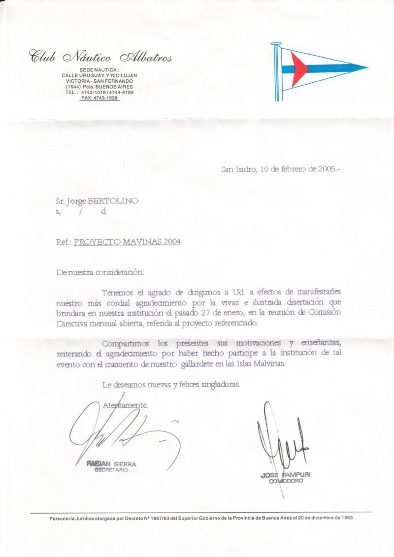 Reconocimiento del Club Náutico Albatros, en ocasión de la conferencia ofrecida a su Comisión directiva y Señores Socios. |
