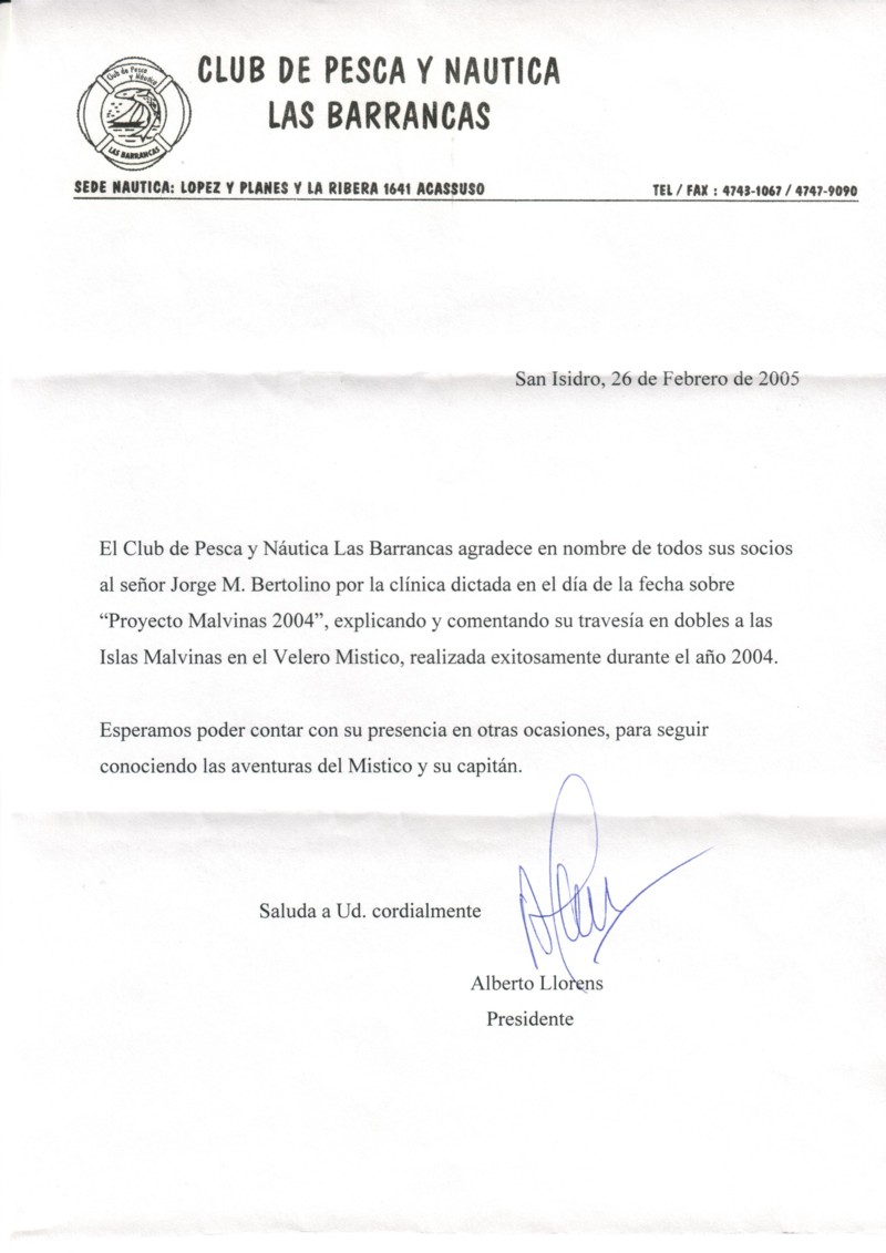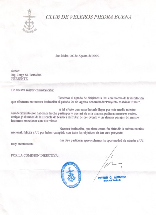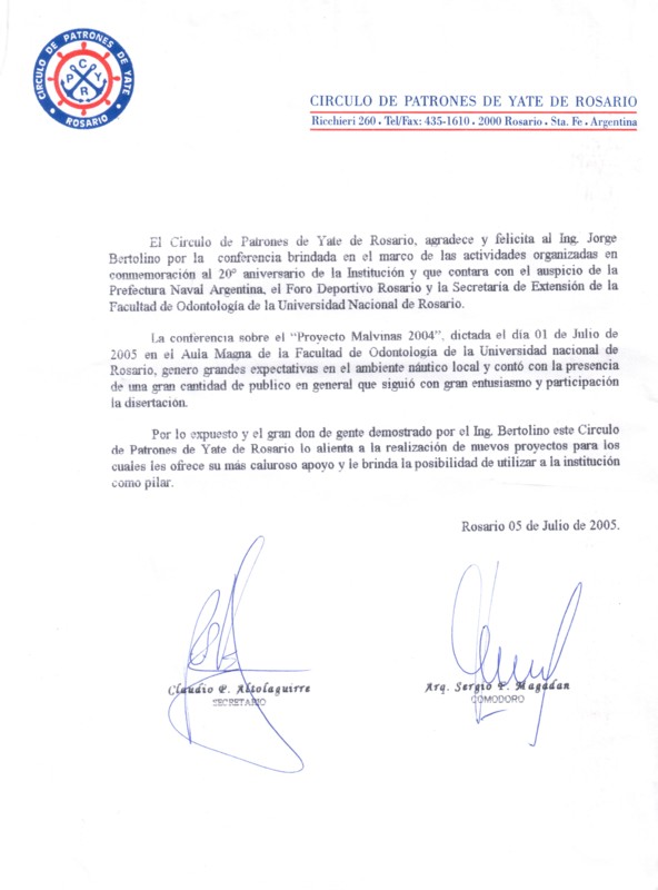 Agradezco profundamente estas y otras atenciones recibidas de los Socios del Circulo de Patrones de Yate de Rosario. Muchas gracias!!! |