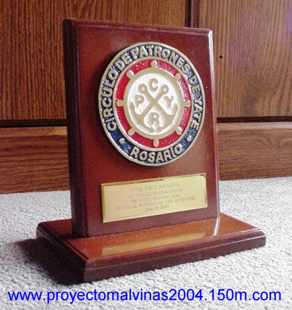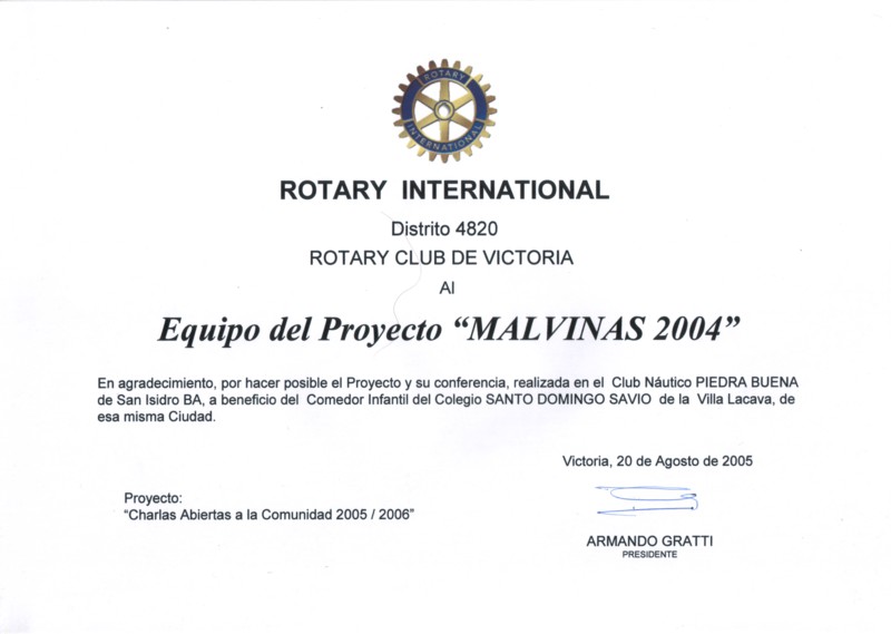 Reconocimiento de ROTARY INTERNATIONAL - DISTRITO 4820 - Rotary Club de Victoria al Equipo del Proyecto "MALVINAS 2004", en ocasión de la Conferencia ofrecida en el Club de Veleros Piedra Buena, organizada por ROTARY CLUB DE VICTORIA, con la colaboración del ROTARY CLUB DE SAN ISIDRO. A beneficio del Comedor Infantil del Colegio Santo Domingo Savio de la Villa Lacava de San Isidro. |