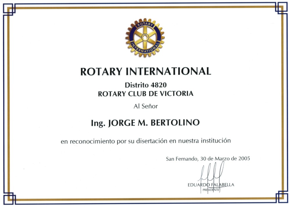 Reconocimiento del ROTARY INTERNATIONAL - Distrito 4820 - Rotary Club de Victoria, en ocasión de la conferencia ofrecida a sus Socios e Invitados Especiales. |
