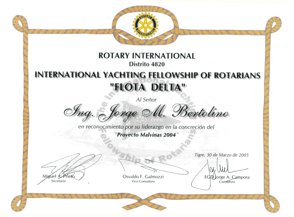Reconocimiento del ROTARY INTERNATIONAL - NTERNATIONAL YACHTING FELLOWSHIP OF ROTARIANS - "FLOTA DELTA", al Liderazgo en la concreción del Proyecto "MALVINAS 2004" |
