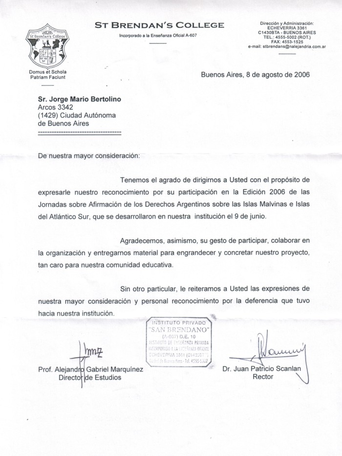 He sido invitado a firmar el "Libro de Oro" del ST BRENDAN'S COLLEGE, en el marco de la conferencia ofrecida a los jóvenes Alumnos del 5to, año de la Escuela Secundaria de dicha Institución, en el marco de la "Jornada de las Islas Malvinas" desarrollada en dicha Institución, en conmemoración del "DIA DE LA PREAFIRMACIÓN DE LOS DERECHOS ARGENTINOS SOBRE LAS ISLAS MALVINAS, ISLAS DEL ATLÁNTICO SUR Y SECTOR ANTÁRTICO" |