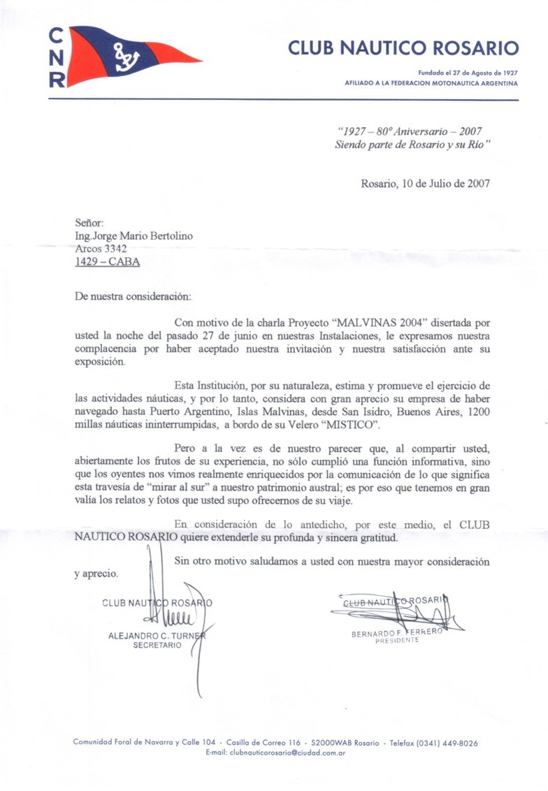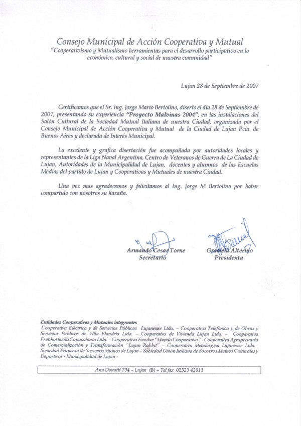 llegar una nota muy generosa, en sus conceptos hacia el Proyecto "Malvinas
