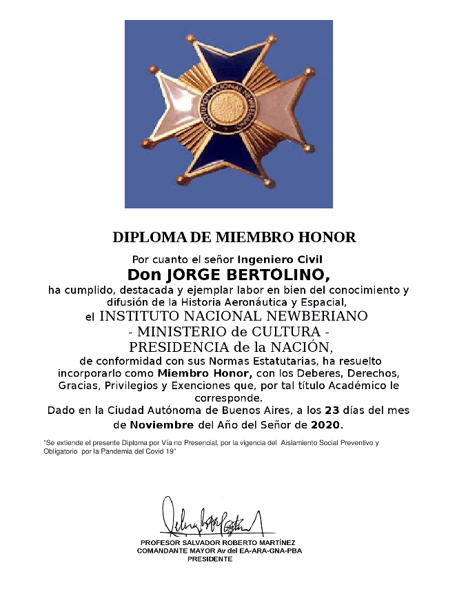 Miembro de Honor del Instituto Nacional Newbewriano (27/5/2020) Nacido el 27 de mayo de 1975, como Instituto de Historia Aeronáutica Argentina "Jorge Alejandro Newbery", fue nacionalizado el 27 de mayo de 1997. Su misión es la investigación, difusión y conocimiento de la Historia Aeronáutica y Espacial Argentina, tanto civil como militar. |